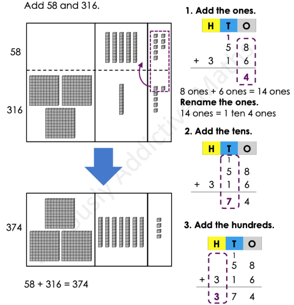 Figure 3. Visual representation of base 10 blocks to teach addition with regrouping.